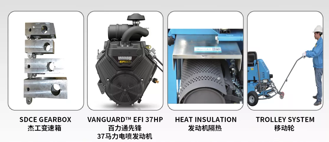 这台抹光机发动机使用了和汽车发动机一样的电喷系统。与传统的化油器版本双缸发动机相比,电子燃油喷射系统不仅让发动机启动更轻松可靠(无阻风门),而且有更大的功率和扭矩,油门响应更迅速。