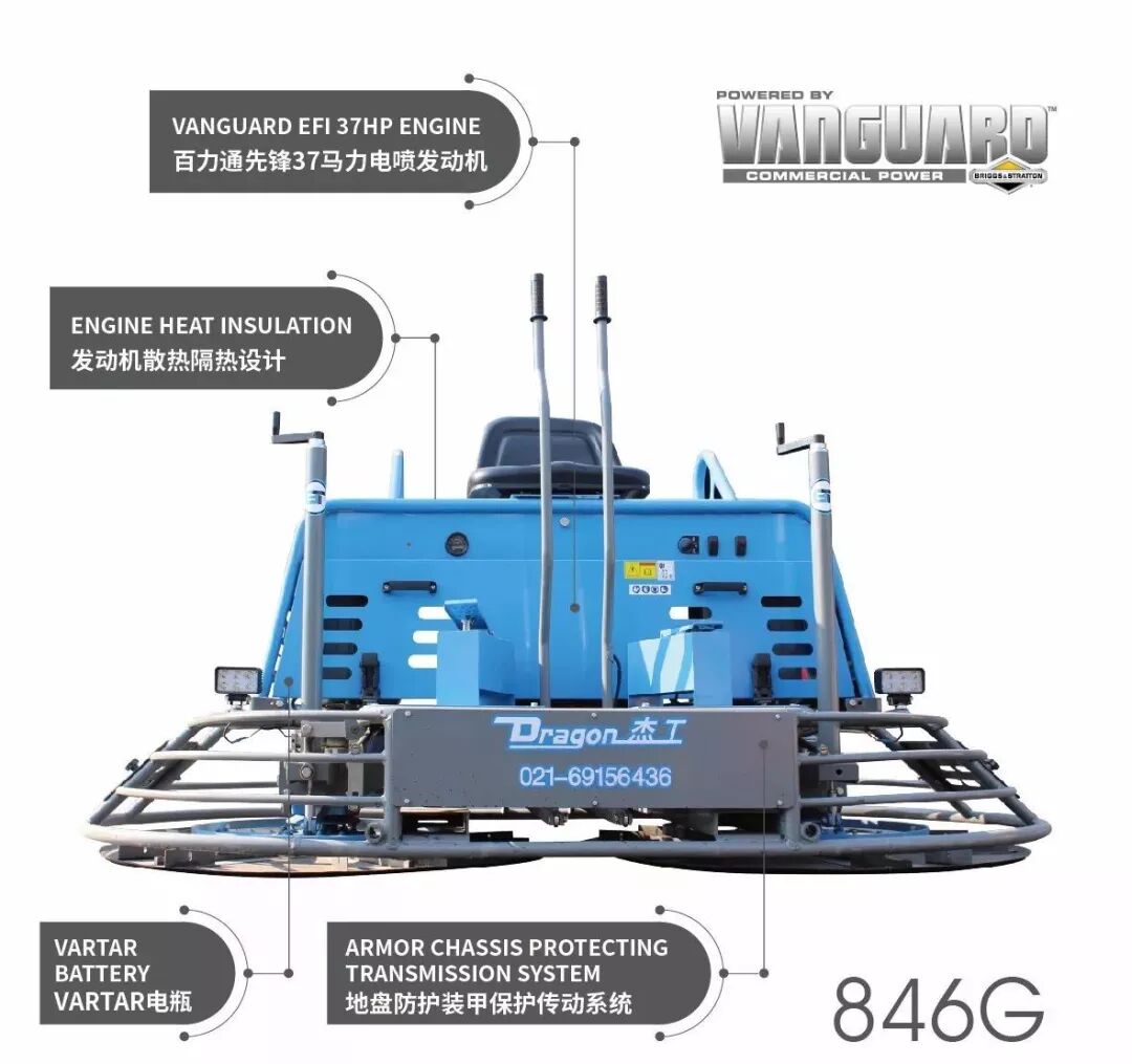 在12月初上海的亚洲混凝土展览会上,国内专业抹光机生产厂家上海杰工推出了中国第一台双缸电喷动力座驾式抹光机。它以百力通先锋双缸37马力电喷(EFI)汽油发动机为动力,是目前国内动力最强劲的汽油动力座驾式抹光机,把座驾式抹光机的施工效率带到了一个新的高度。